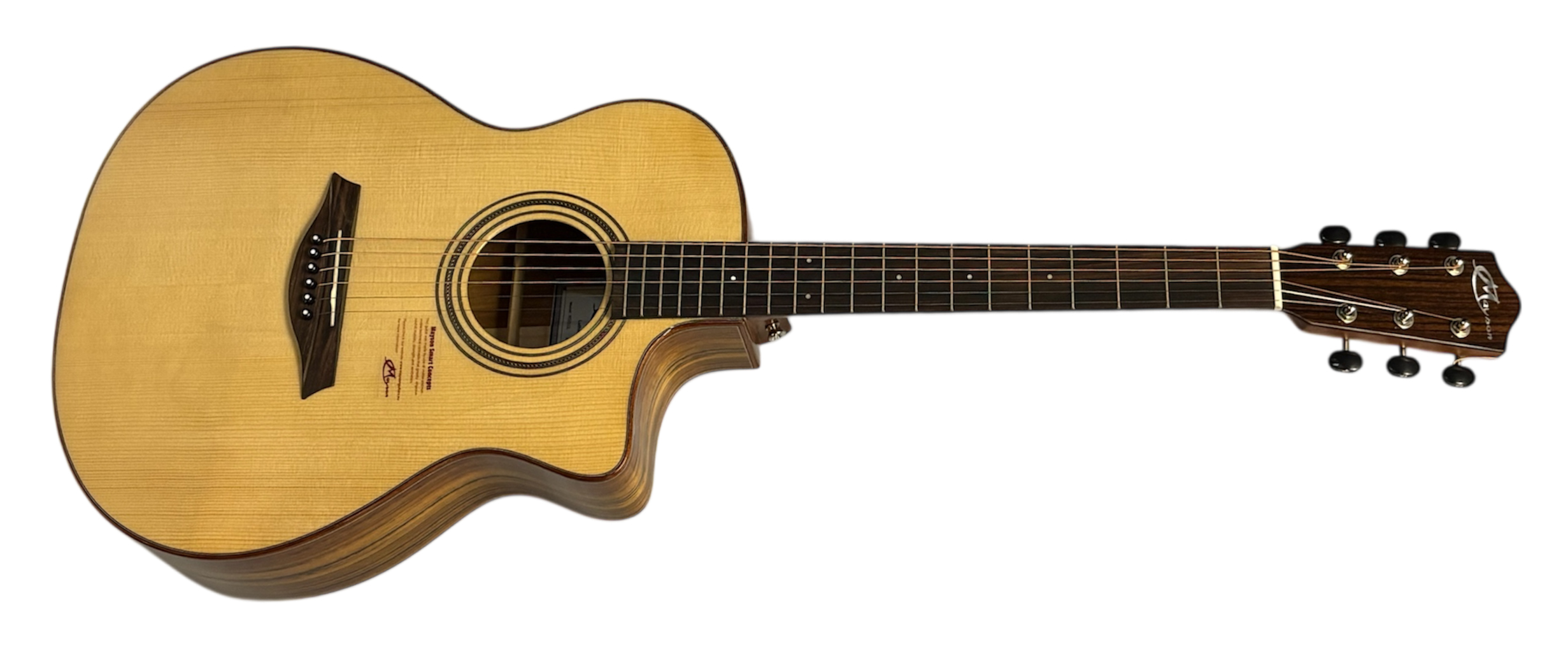 Chitarra Acustica elettrificata – Finitura Hi Gloss PU – Serie Luthier – Fasce e fondo in Ovangkol – Tavola in Abete Massello – Spalla mancante – Manico in Mogano – Scala 589mm – Preamplificatore EQ MD-100 – Corde D’Addario – Gig Bag inclusa